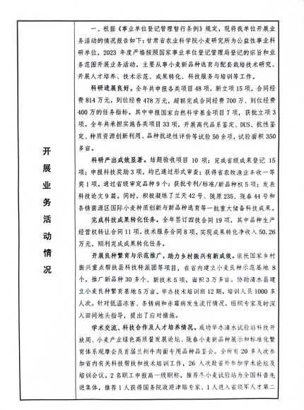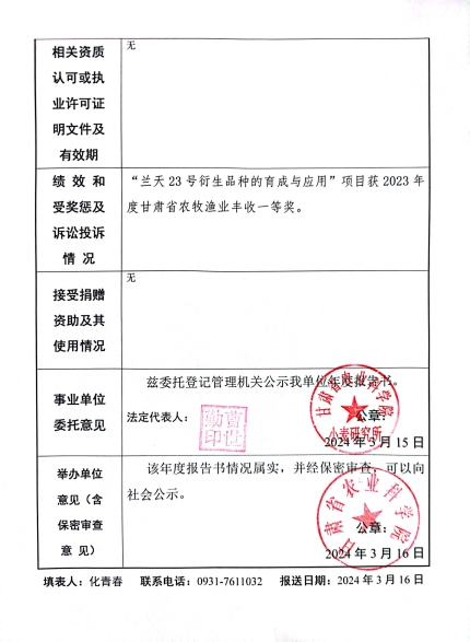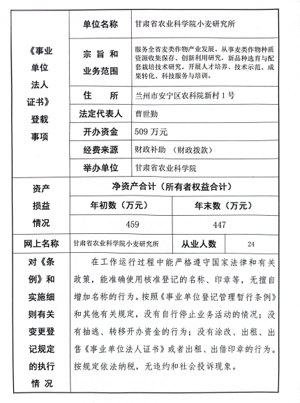 根据甘肃省事业单位登记局法人证书年检流程,现将我单位2023年度事业单位法人年度报告书在院局域网予以公示,对报告书填写内容的真实性给予监督。