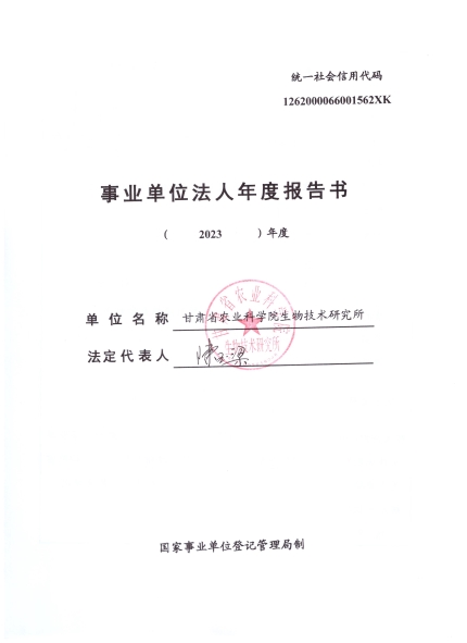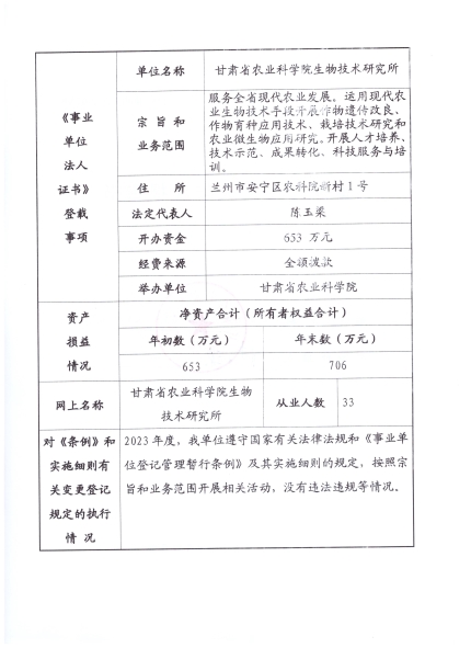 根据甘肃省事业单位登记局法人证书年检流程,现将我单位2023年度事业单位法人年度报告书在院局域网予以公示,对报告书填写内容的真实性给予监督。