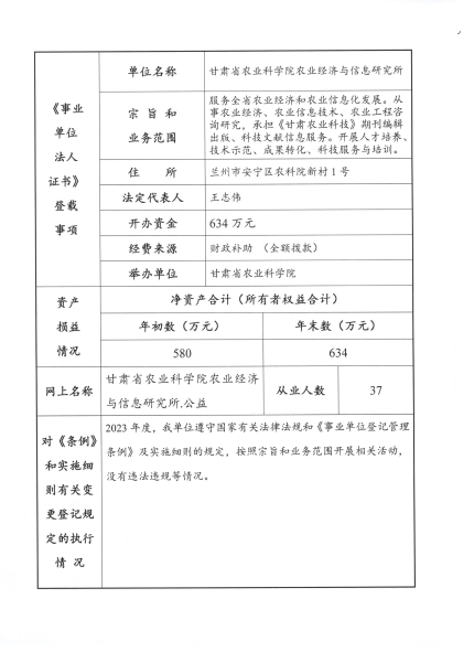 根据甘肃省事业单位登记局法人证书年检流程,现将我单位2023年度事业单位法人年度报告书予以公示,对报告书填写内容的真实性给予监督。