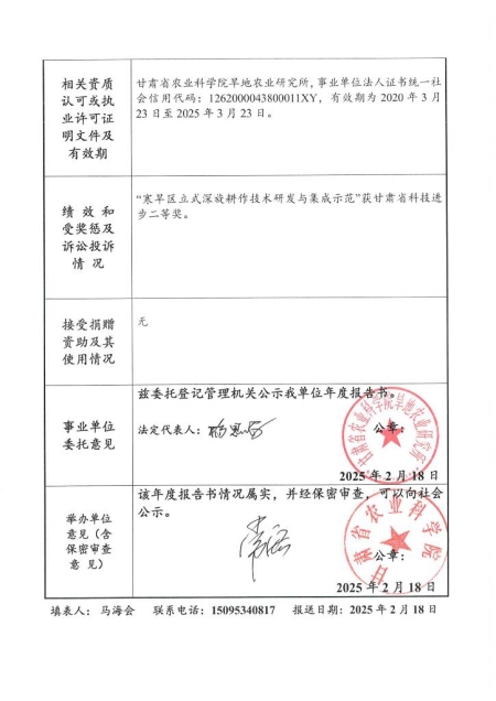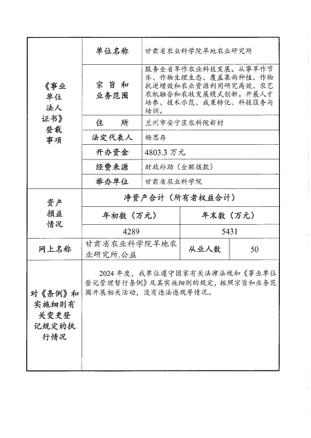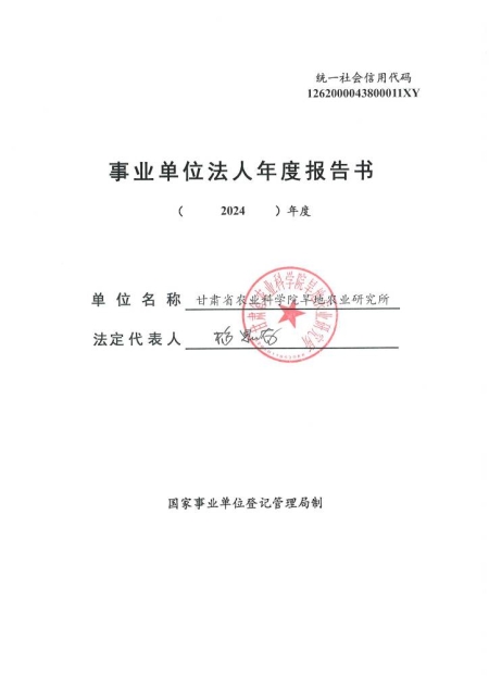 根据甘肃省事业单位登记局法人证书年检流程,我单位法人证书的年检报告书需在院局域网上进行公示,现将我单位2024年度事业单位法人年度报告书予以公示,对报告书填写内容的真实性给予监督。