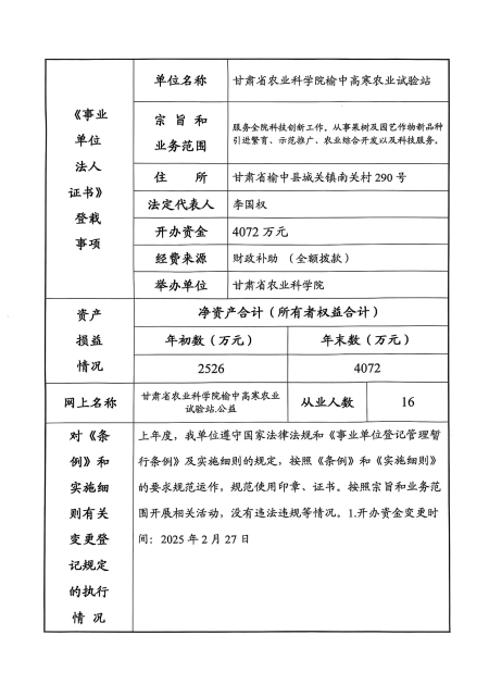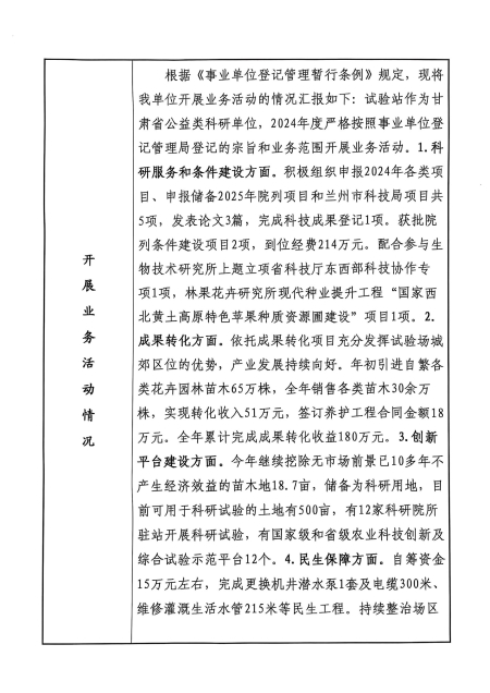 根据甘肃省事业单位登记局法人证书年检流程,现将我单位2024年度事业单位法人年度报告书予以公示,对报告书填写内容的真实性给予监督。