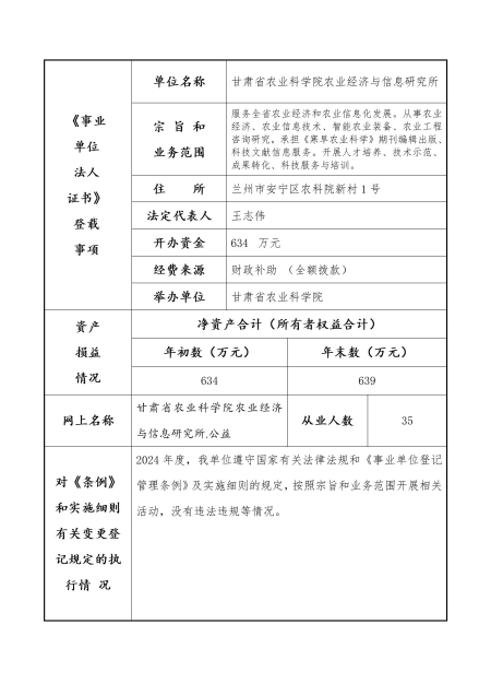 根据甘肃省事业单位登记局法人证书年检流程,现将我单位2024年度事业单位法人年度报告书予以公示,对报告书填写内容的真实性给予监督。