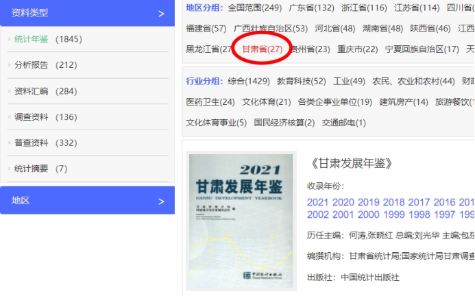 第四步:点击要查询的地区和行业分组,比如“甘肃省”;
