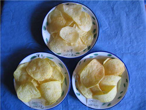 特征特性:晚熟,生育期(出苗至成熟)120天左右,株型半直立,株高80cm左右,幼苗生长势较强,植株繁茂性中,茎浅紫色,叶片墨绿色,花冠白色,天然结实性弱。结薯集中,单株结薯6~8个,薯块长椭圆形,黄皮黄肉,芽眼少而极浅,薯形美观整齐,大中薯重率90.0%。薯块休眠期长,耐贮藏。薯块干物质含量26.0%,淀粉含量19.68%,还原糖含量0.17%,粗蛋白含量2.37%,维生素C含量25.2mg/100g,蒸煮食味优,炸片色泽评分95,适合油炸加工。高抗晚疫病,对病毒病有较强的田间抗性。