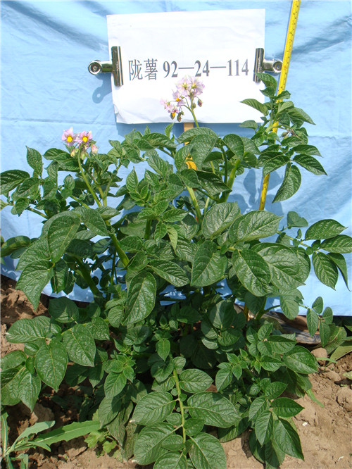 栽培要点:高寒阴湿、二阴地区4月中旬播种,半干旱地区4月上、中旬播种。密度一般3500~4000株/亩,旱薄地2500~3000株/亩。重施底肥而且氮、磷、钾配合,早施追肥,切忌氮肥过量。苗期至现蕾期采用代森锰锌、百菌清等喷雾防治早疫病,每隔7~10天喷一次,连续防治2~3次。选用脱毒种薯,或建立种薯田,选优选健留种。
