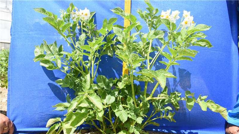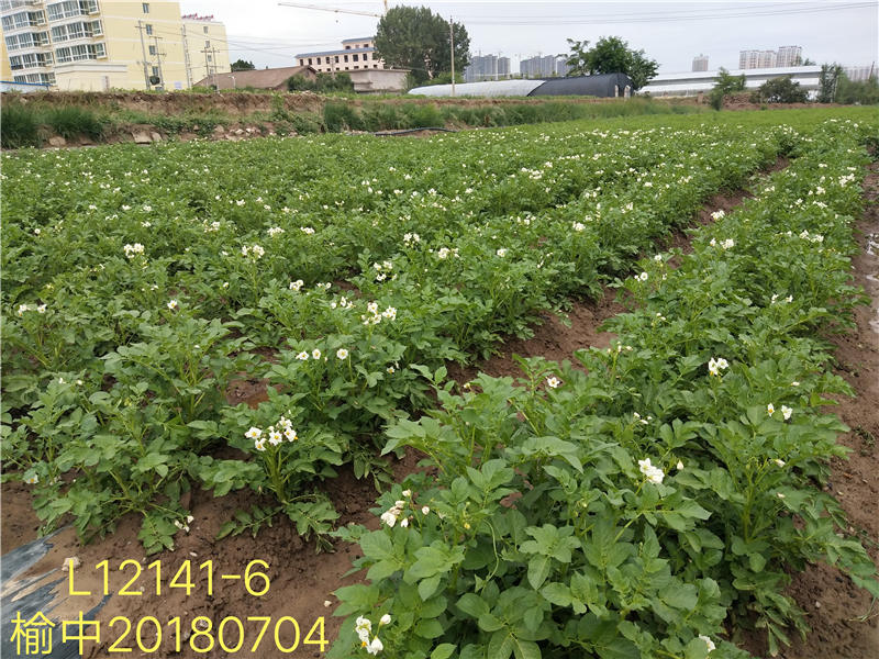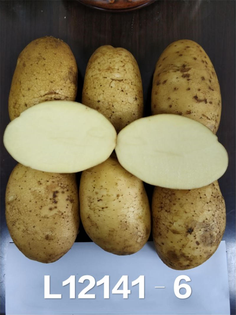 陇薯20号(系谱号L12141-6),中熟(出苗至成熟89天),2019年育成,正在申请国家非主要农作物品种登记。薯块椭圆形,薯皮光滑,白皮白肉,芽眼浅,薯形评价好,食味优。结薯集中,单株结薯4.5个大中薯率90%以上。薯块含干物质18.1%,淀粉12.09%,粗蛋白2.21%,维生素C 14.4 mg/100g,还原糖平均0.09%。适宜鲜食菜用。抗卷叶病毒病,较抗花叶病毒。适宜我省沿黄灌区、白龙江流域及近郊川水地区栽培。