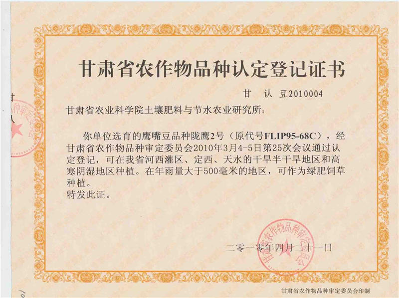 陇鹰2号抗旱性强、速生、蛋白质含量高,每株结荚30-150个,每荚1-3粒种子,籽粒亩产量154.6公斤,亩产鲜草2672.7kg。适合在甘肃河西灌区、定西、天水的干旱半干旱地区和高寒阴湿地区种植,亦可在我国西北、东北、华北地区种植。