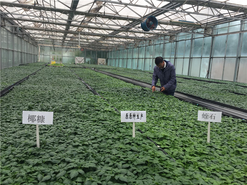将马铃薯脱毒组培苗定植到防虫网棚或日光温室后生产出重1g以上的微型种薯叫原原种。繁殖方式有接地法和离地苗床两种,基质主要有珍珠岩、蛭石和椰糠等,铺设厚度6~8cm,适宜的PH值为6~7;脱毒组培苗定植密度160~220株/㎡,营养液以MS培养基大量和微量元素为主,温度保持15~27℃,及时预防病虫害,适时收获。
