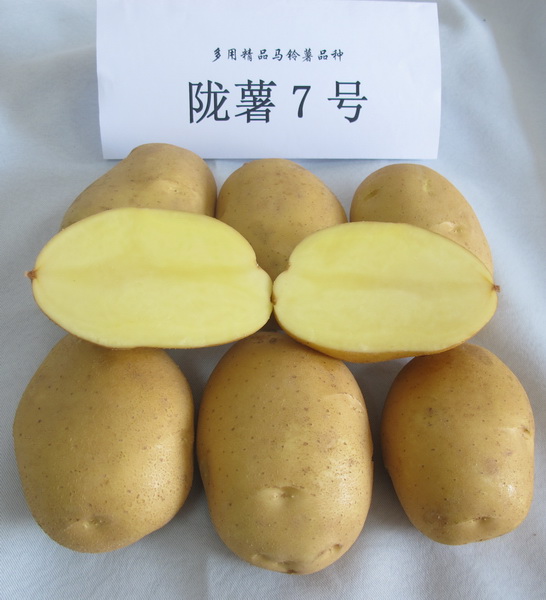 陇薯7号是马铃薯研究所1999年以庄薯3号为母本、引进油炸加工型品种菲多利为父本组培杂交定向选育而成,2007年通过科技成果鉴定,达国内领先水平,2008、2009年相继通过甘肃省和国家审定,2014年农业部推荐为农业主导品种。2015年以来作为原料品种开展主食产品相关研究,2016年获植物新品种权保护。该品种薯块外观、营养和加工品质俱佳,薯块椭圆形,芽眼极浅,薯皮黄色,薯肉黄色,薯块含干物质25.23%,淀粉18.75%,维生素C 20.31mg/100g,粗蛋白质2.68%,还原糖0.177%,耐氧化褐变,适宜鲜食、淀粉、全粉和主食加工。甘肃省区域试验亩产1978.6kg,增产76.5%,居13份参试品系的第2位,国家区域试验亩产1912.1kg,增产29.5%,居7份参试品系的第1位,2006年在省区域试验秦王川点亩产4782.0 kg,产量潜力大。经田间自然感病和室内人工接种鉴定,陇薯7号高抗晚疫病,抗马铃薯Y病毒。国家区域试验表明,陇薯7号是该届所有参试品系中稳产性、适应性最好的品种,适宜在北方一作区、西南混作区、南方冬作区种植。